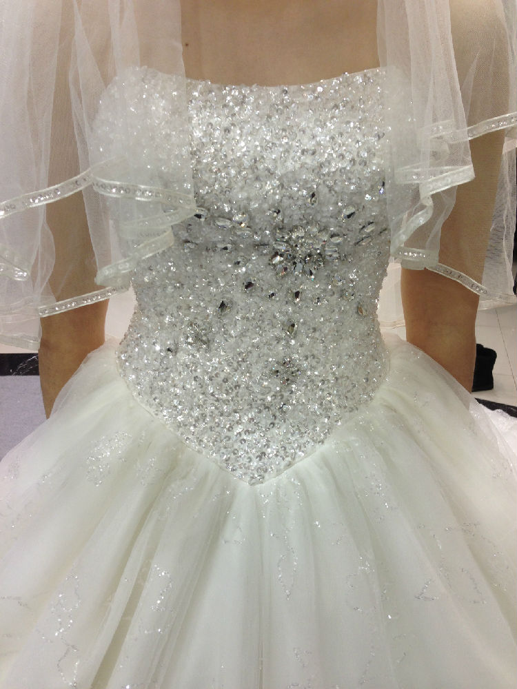 新娘如果有宽阔的肩膀同样可以选择抹胸式,宽肩的注意力转移到胸部