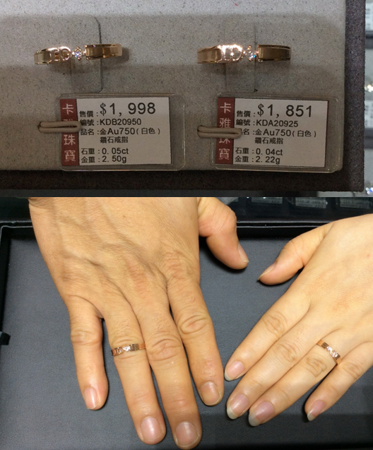 买完手表就回酒店休息上网等bf回来,在微信跟朋友聊天时,3hk公众号弹出一链接看到上面推荐的情侣对戒性价比不错哦,不由心动起来。bf回来时就跟他说想去看下,于是我们吃完晚饭就按照微信上面的路线直奔卡雅珠宝淘货。来到卡雅,跟店员说想看对戒,店员拿了几款对戒给我们来回的挑选,最终看中了这款(我愿意“id”玫瑰金情侣钻石对戒)