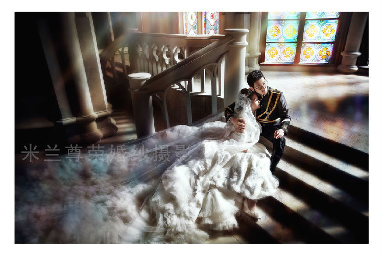 胸部小搭配短丝巾是最能转移人们目光焦点的,而长丝巾则不行。精致小巧的项链是很好的选择,同样能转移人们的焦点。胸花、胸饰增添婚纱照的的画面刚。 |