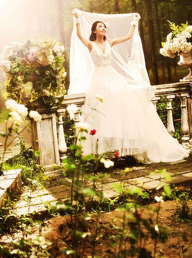 外景:水景区白纱。好像是这件,v领的白纱,很飘~