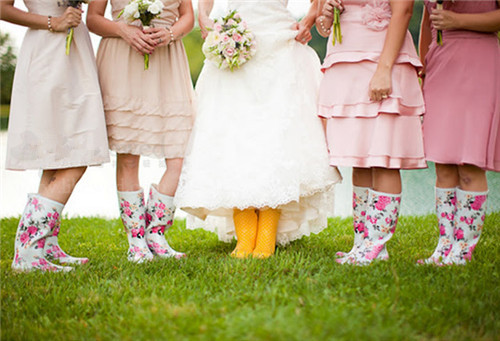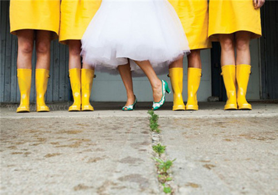 1、亮黄色雨靴搭配黄色礼服 亮黄色雨靴搭配黄色礼服,与新娘的绿色婚鞋拼凑起来,显得十分靓丽清新。