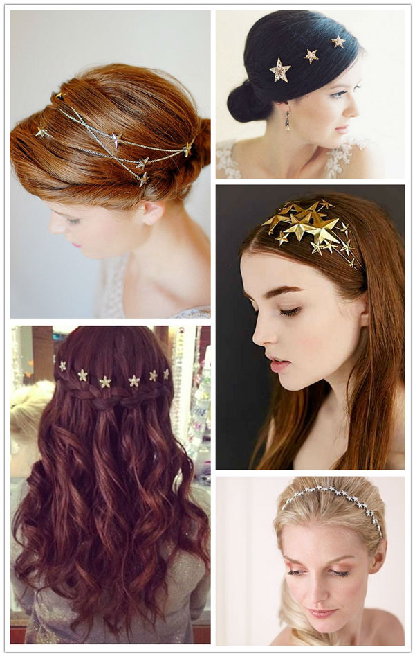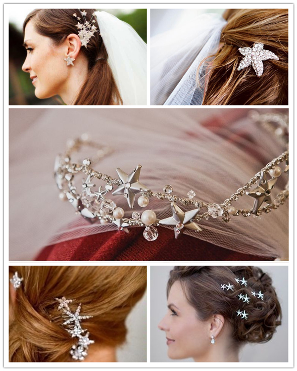 大大小小的星型发饰萦绕在发间,搭配优雅的盘发或甜美的卷发,再配上美丽的头纱,女王范儿十足,赶紧为自己选择一款心仪的星型发饰吧!