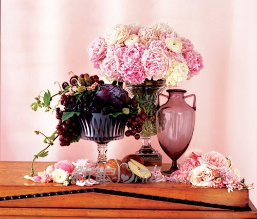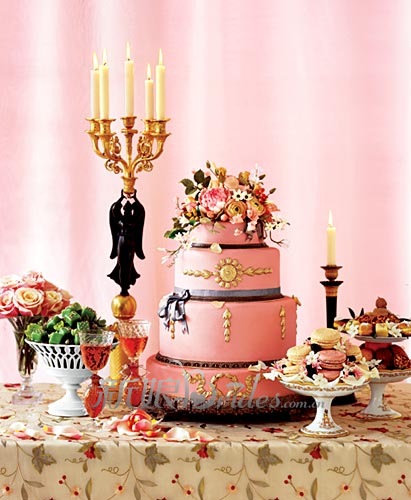 古典盛宴 典雅而丰富的色彩,精美考究的器皿,成就了一场古典奢华的婚礼盛宴:盛满诱人甜点的白色金漆高脚盘与造型独特的酒杯和古董枝状烛台相互掩映,瞬间将遥远的彼德麦时代拉到眼前;托盘中,杏仁饼与茉莉花一并芬芳,默默散发温情。粉色软糖覆盖的四层蛋糕,彼德麦式镀金饰物流光溢彩;顶端清雅繁复的糖果花束为纯手工制作,玫瑰、牡丹、芍药、茉莉、金丝桃莓、香豌豆花、洋桔梗、圣星百合……争奇斗艳、甜香四溢。