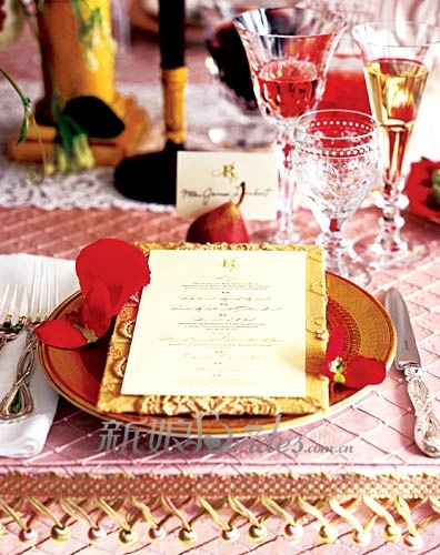 镏金席位卡 亚麻、银器、瓷器、水晶,餐具质地的对比与互补营造出奢华而又独一无二的样式。精美的古董瓷盘、帝国风格烛台以及饰有垂珠的丝绸刺绣台布,凸显出彼德麦风的精致高雅。席位卡与菜单端放正中,富于质感的奶油色卡片表面,金箔花写体字线条灵动,金色蕾丝映衬着天鹅绒般的绯红花瓣,细微之处彰显完美品位。欧式、美式两种风格的水晶高脚酒杯默立在侧,剔透折射新人的纯美爱恋。925纯银餐具漫放微光,静候饕餮盛宴的开幕。