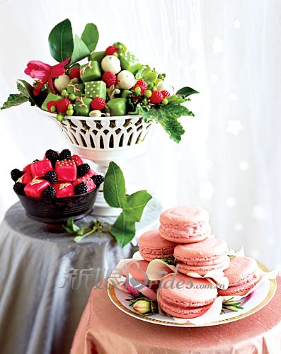 美味甜点 地道的婚宴上怎么可以缺少法式甜点?精巧古董瓷盘里,满溢的花色法式软糖小蛋糕间点缀可口覆盆子,粉色杏仁饼时刻对宾客的味蕾散发着诱惑,令人回味无穷。