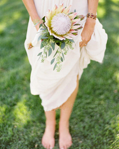 单朵手捧花一度令很多新人着迷,也掀起了一股用单朵鲜花制作新娘手捧花的风潮,可是很多新人至今不知道这花叫什么名字,秀雅中不失霸气的她有着同样气质的名字,帝王花。帝王花又叫菩提花,是南非共和国的国花,其以巨大的花魁,异常美丽的色彩与优雅的造型,脱颖世界名贵花卉。帝王花中的花蕊可以开放很长时间,所以也相当适用于鲜花切花,在国内其属于进口花材,要提前向花商预订。