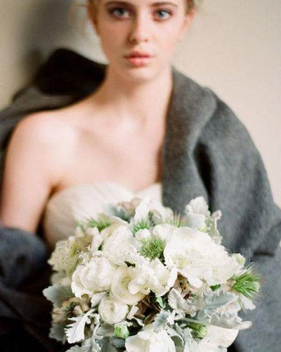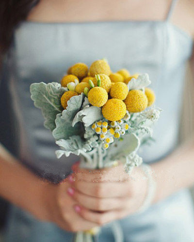 这款手捧中银色的叶材,你是不是也在其它各类西式婚礼图片中看到过?银灰色的质感无论搭配纯净的白色、清新的绿色还是其它艳丽的色彩都相得益彰。它叫银叶菊,属于菊科的一种,其正反面都有银白色的柔毛,是很受青睐的观叶植物。