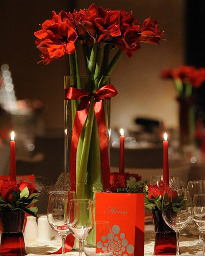 朱顶红,又称孤挺花、百子莲等,是日本婚礼花艺中的常用花材。花色柔和艳丽,花型硕大肥厚,非常适用于花艺造型。其花色种类丰富,有大红、玫红、橙红、淡红、白色、蓝紫色、绿色等,比较常见的是红色与白色,其冷艳高贵的气质非常适用于酒店婚礼桌花布置。