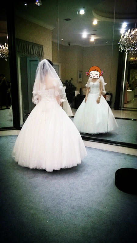 由于楼主在此之前从未试过婚纱,所以特别的激动!那种感觉无以言表! 而且宝娜家的活动也超吸引人的,因为我们的婚纱照订的是米兰家,所以假如我们再定宝娜嫁衣的话,就会立减800元现金!再加上如果有熟人介绍的话,婚纱还可以往上升级!光是以上的活动,就已经超赞了!还不止哦!你可以积分兑换券,还有米兰发帖积分换券,这些都可以用在这个上面的哦!算起来你能省一千多块钱呢!实在诱人!而且最主要的是他们家的婚纱实在是很漂亮!很有档次的那种!!做工什么的都特别的细致,不光是主纱,包括所有的礼服质量也一点也不马虎!因为时间关系,虽然当天我没有试礼服,但是我让他们拿几件给我看了下,手工真的一个字——赞! 他们家还有个优点就是款式超多,不像有的婚纱店,主纱就那么几件,么的选择!他们家不,让你挑花眼,挑不出最、、、不亏是大店!! 那么好的优惠,我肯定立马下单啦~!店员说后面还会陆续来很多的新款,到时候还可以到他们家来试穿!太棒啦!! 临走之前路过一排婚纱架,还是情不自禁的不忘再拍两张!