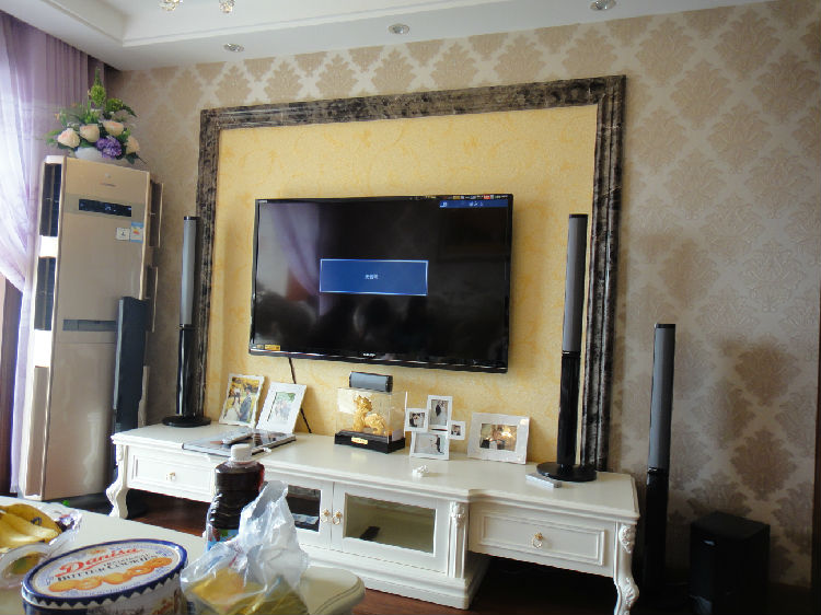 再进去就是客厅啦,组合的布艺沙发还有欧式代表性的吊灯。再来张电视背景墙的正面照~