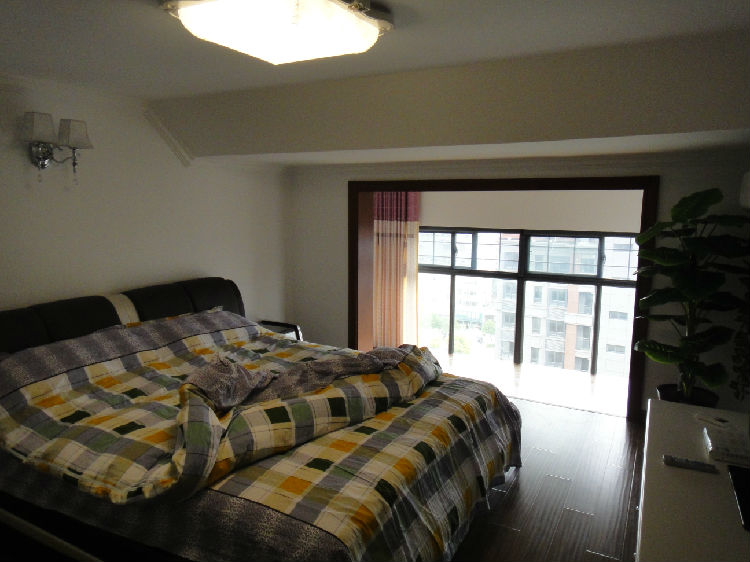 上来左边就是一间大卧室,还有带落地窗的阳台,光线非常好。