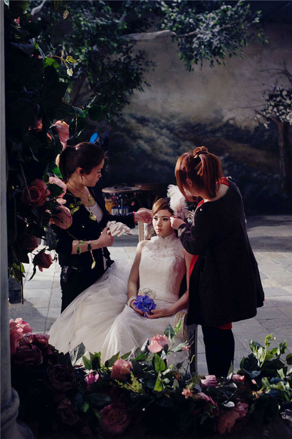 这张是小编我这次探片场拍的最喜欢的一张,很有感觉哦,哈哈,小编我自恋了!隆重介绍下,这位图中戴头饰的人是我们片场最可爱的~~~~~~小莫总监~~鼓掌~~~!!不知道小莫总监看到这张照片会不会喜欢呢?期待了~~!!不过还是先让米粉们看看吧~!!(新娘子好漂亮的说~!)