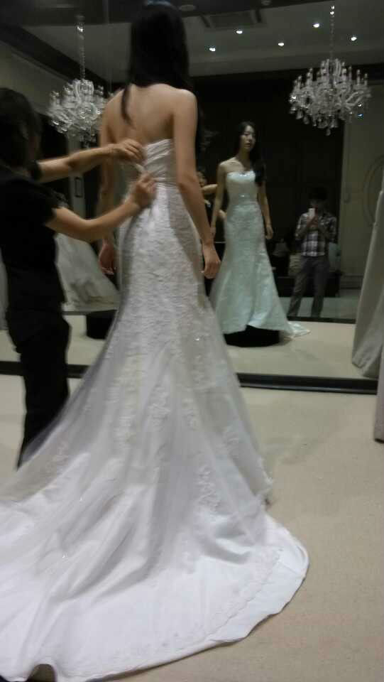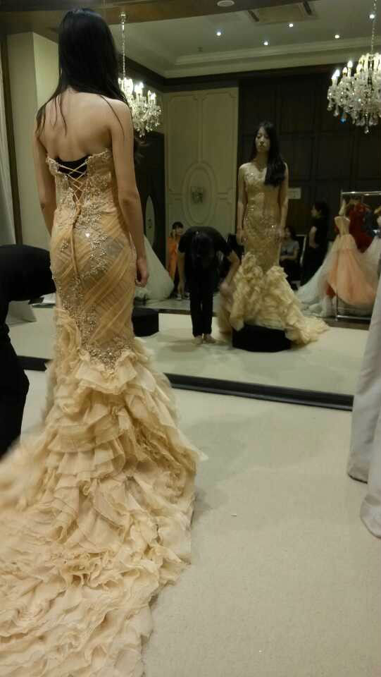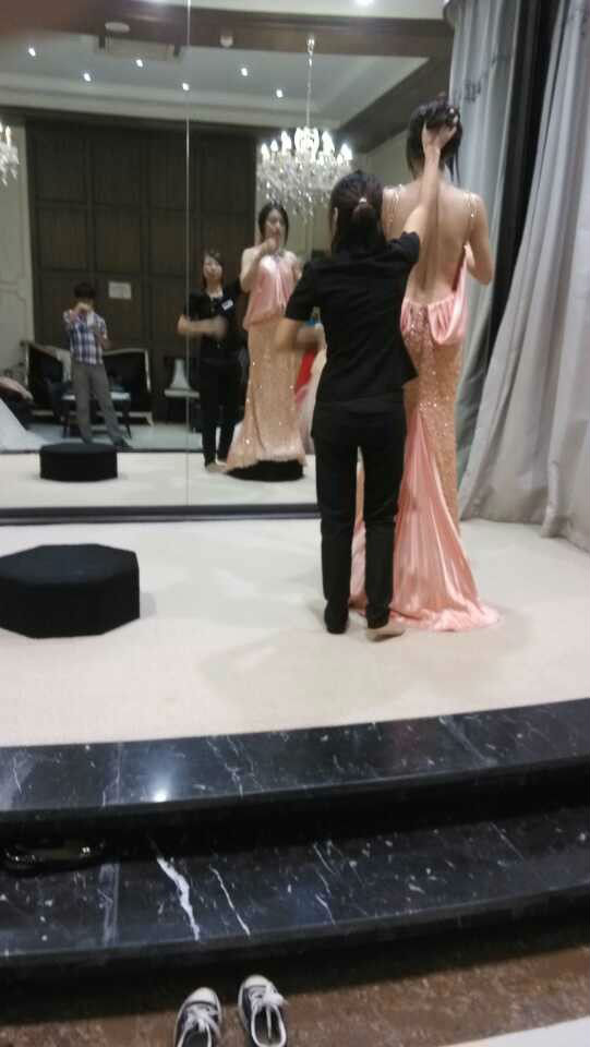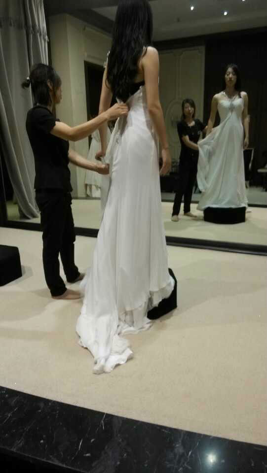 第三件,水晶区的外景白纱(第一件是挂脖的,胸口和带子都很闪,身上的衣服材质是沙质的,垂感很好很漂,我很喜欢。第二件是抹胸修身的,简单,我老公很喜欢,所以还是选了第二件)