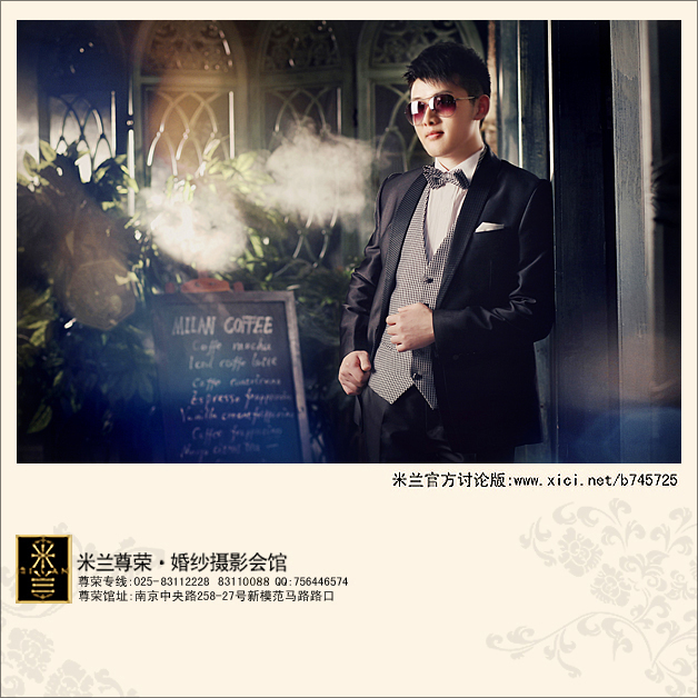 第一幅,帅哥带着墨镜,很帅气呢。手攥成拳头,横在腰前显得很胸有成足。第二幅,是个黑人帅哥的海报,对着镜头做了个手势,是不是很帅。小宁子觉得可以把他伸出来的名片上的字ps下,上面写的“好男人”(好吧,我承认,这个是小瓶子的idea,我们一起分析照片的时候他说的。)第三幅,网上找的,帅哥耍酷。我记得米兰有这种带领结的西服,哥哥可以整整自己领结,表情显得坏坏的。第四幅,沙发沉思型,动作有点像托腮的改良版,腿部可以休闲店,一个腿可以翘到沙发上。第五幅,凭窗眺望型。男生只要靠在窗台站着,双手斜插在口袋里就可以了。第六幅,最爱彭于晏的,45度仰望天空(让我想到了四娘,呃呃呃)这样下巴会很帅,眼神也要透露着甜蜜。【写在最后】拍摄婚照是情侣一起将自己的幸福的瞬间定格在胶片上的一种展示。所以小宁子觉得大家还是不要太自私,套用婚族一个加盟商的话,焦点并不是只有女生哦,也要给我们家的哥哥一些展示自己的机会哦。所以欢迎大家借鉴小宁子的推荐,然后自己也多想想,找到一些适合你家哥哥的独照姿势,让你们的婚照男女搭配的更好哦。1楼