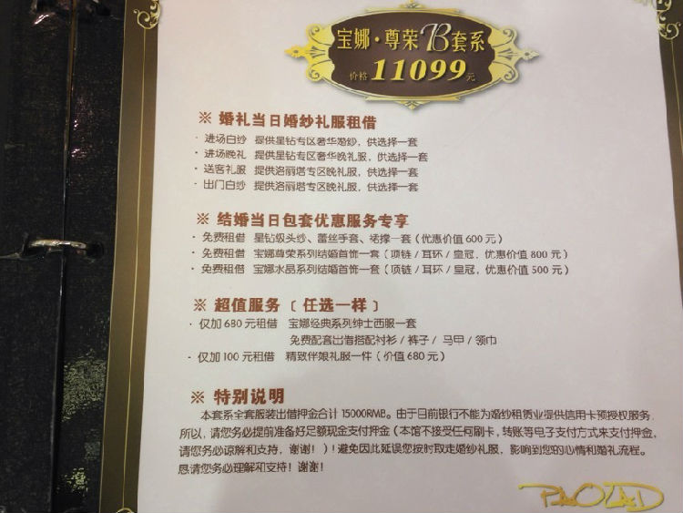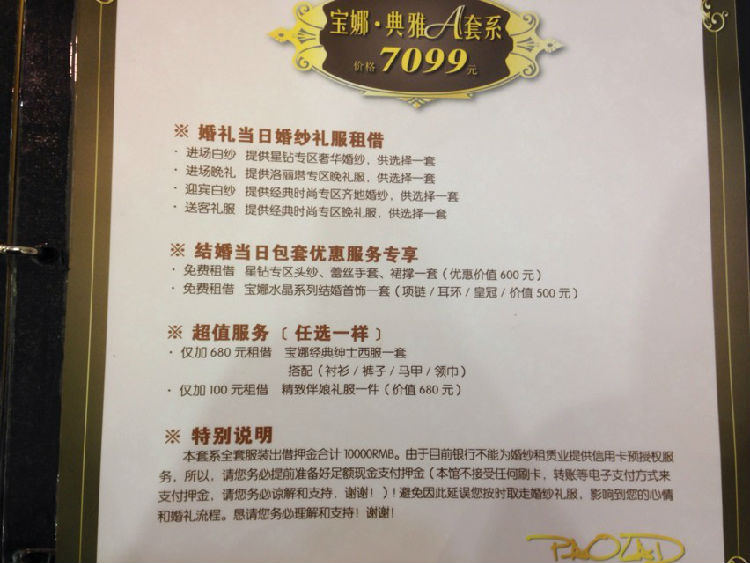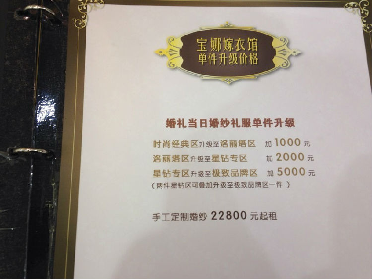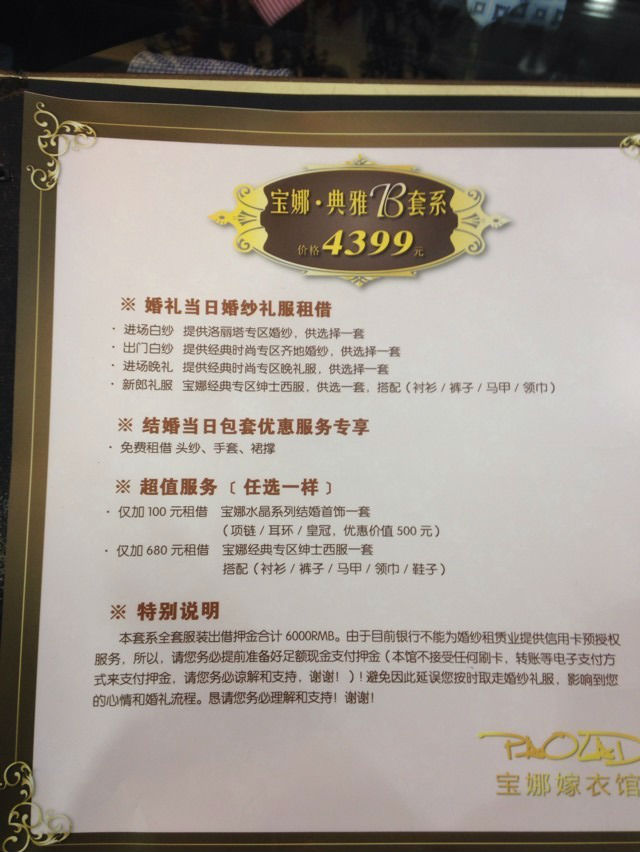 【幸福娜宝贝】十,小逸带来宝娜套系价格对比小逸之前带大家看了那么多宝娜的衣服,都没想到给大家分享下宝娜家不同价格的套系呢~哈哈!先来说下宝娜家礼服是分四个区域,由高到低分别是时尚经典区,洛丽塔区,星钻区,品牌区,然后宝娜家的套系又分为4个档次,分别是4399,7099,11099,和19099.我们先来说最屌丝的4399套系,我自己定的也是这个套系~4399套系里面有一件洛丽塔区的主纱,一件时尚经典区的出门纱,两件时尚经典区的晚礼服,或者是一件时尚经典区的礼服,一件gg的西服,这个是可以自由调节的,只要总数是四件,按照划分的区域去选择就可以了7099套系里面是一件星钻区的主纱,一件洛丽塔的晚礼服,一件时尚经典区的出门纱,一件时尚经典区的晚礼服,不得不说星钻区的衣服比洛丽塔区的美不少呢~而且这个套系里面还可以免租一套水晶系列的饰品,这个其实也蛮重要的,如果有的mm觉得跟妆师那里的饰品不够理想的话就可以直接从宝娜带走饰品啦,其实这个套系的性价比是最高的,因为星钻区的衣服真的好漂亮呢11099套系里面是一件星钻区的主纱,一件星钻区的晚礼服,一件洛丽塔的出门纱,一件洛丽塔的礼服,还可以免费租两套饰品,分别是尊荣区和水晶区的,这个套系里面能选两套星钻区的衣服呢~都是米啊!19099套系真的是奢华套系了!里面有一件品牌区域长托;两件星钻区域晚礼服;一件洛丽塔区域齐地纱。然后四套婚纱的饰品全部都配好~白富美首选啊!嘻嘻~然后要想区域升级的话说这样的:尚经典区升洛丽塔区加1000元 洛丽塔区升星钻区加2000元 星钻区升白富美品牌区加5000元 小逸自己订的就是4399的套系,因为订的早,参加了不少宝娜的活动~目前已经屯了2000升级券在手上啦~可以升级两件礼服为洛丽塔区的了!争取多拿点升级券,慢慢往上努力呗~喜欢宝娜的不要犹豫啦~宝娜一年涨2次,早订早划算呢!而且宝娜家的线上线下活动也是比较多呢,只要努力,大家都可以升级区域穿的美美的礼服呢!如果在宝娜订单的话记得提前联系我哦~现在宝娜老带新活动,各送1000元升级券呐!划算呢!