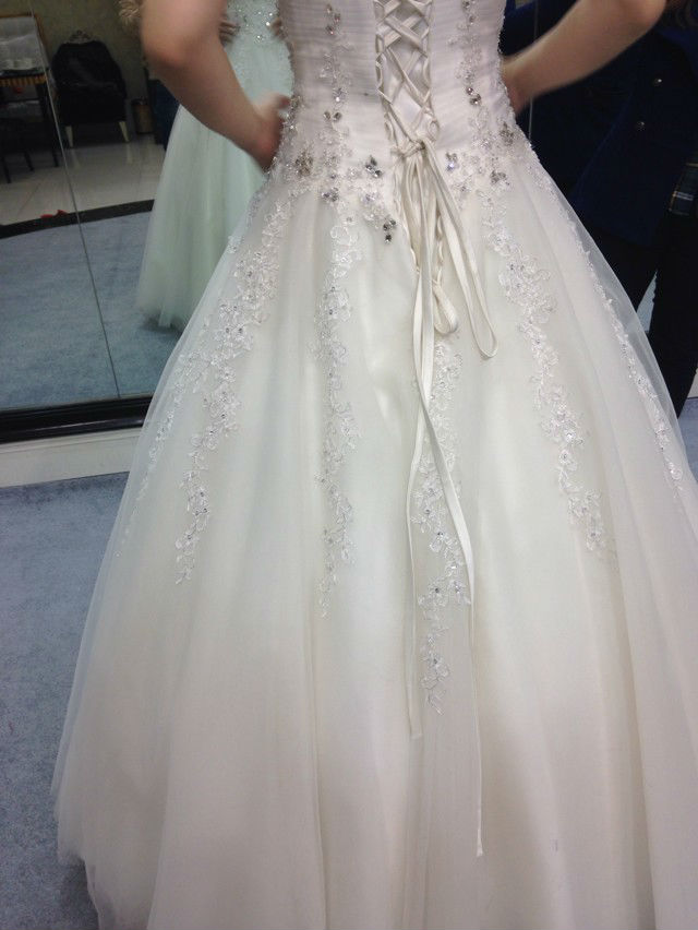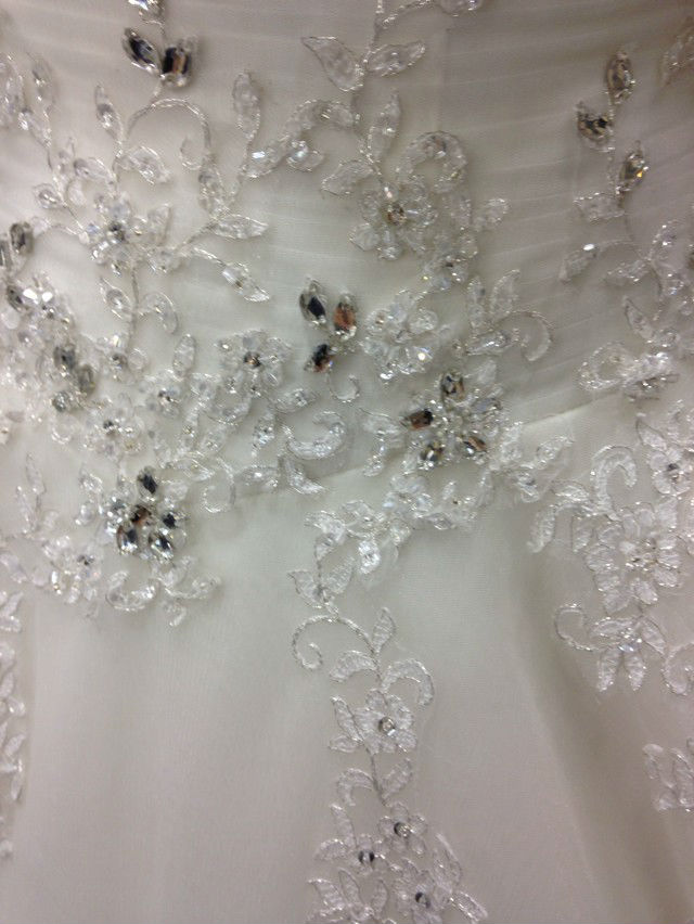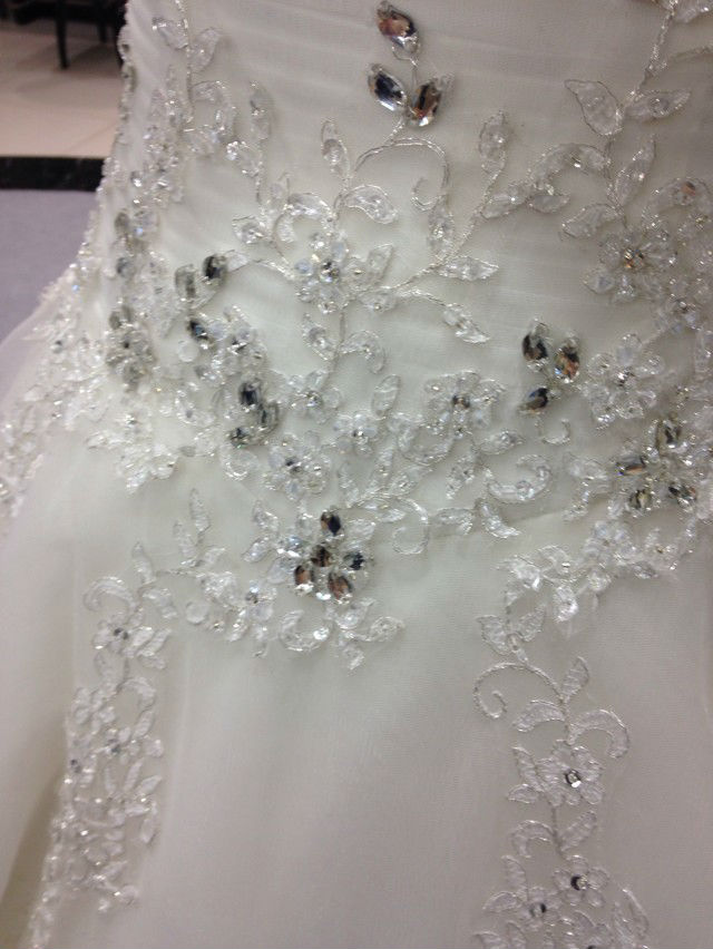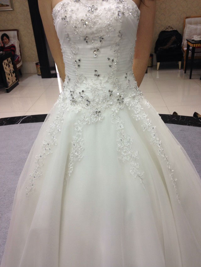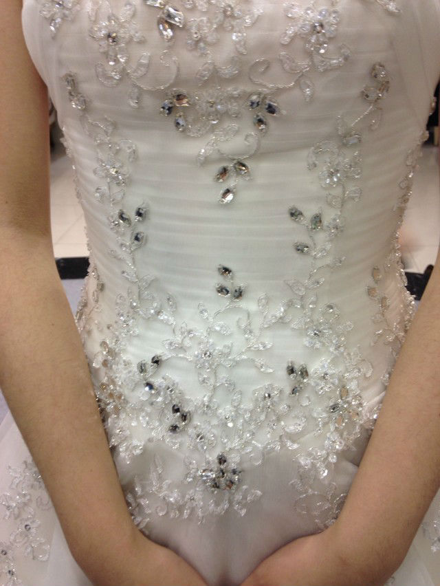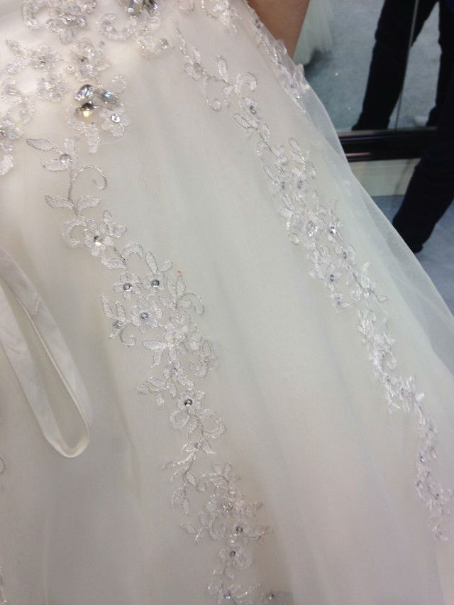 没有太繁琐的工艺,就是简单的绣功和亮钻的搭配,从腰部散落几束花藤,自然清新的甜美