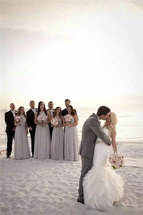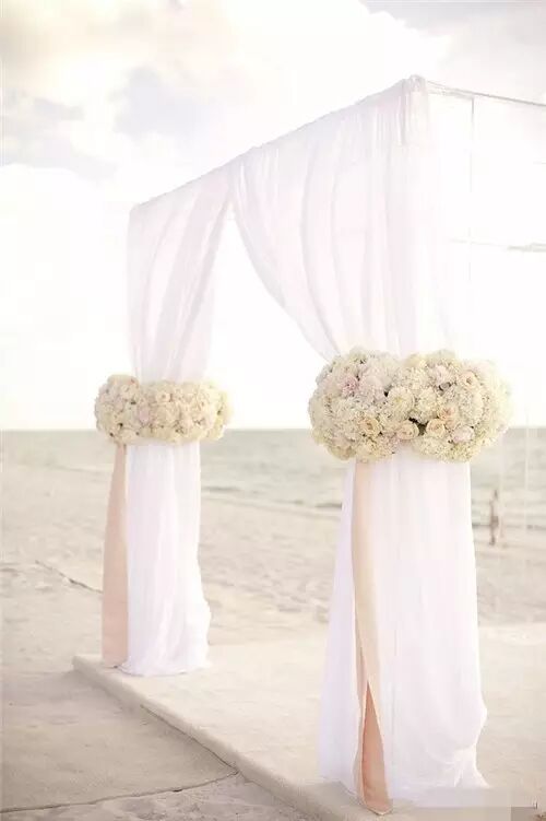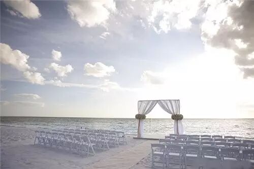 婚礼的仪式选在海边的沙滩上,无尽的大海,海天一色的美景,柔软温暖的沙滩上摆放着纯白的椅子,透明的仪式花亭上盖上了几片帷幔,随风飘扬。用巨大的花环来笃定飘逸的帷幔,纯白的绣球花中点缀几朵淡粉、淡黄色的大马士玫瑰,让花亭多了几分浪漫。