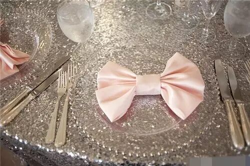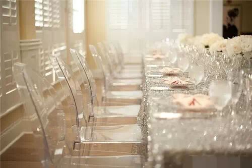 宴会厅中,一切都仿佛是晶莹剔透的,透明的椅子,透明的烛台,透明的餐具、酒杯。银色亮片桌布更是让整个餐桌显得亮丽,仿佛在散发着水晶般的质感。高大的透明烛台下几簇纯白的花朵,让桌花的布置显得丰满又有生机。作为银色的绝妙搭配,粉色也以小面积的蝴蝶结餐巾造型出现在了婚礼中,浪漫可爱。